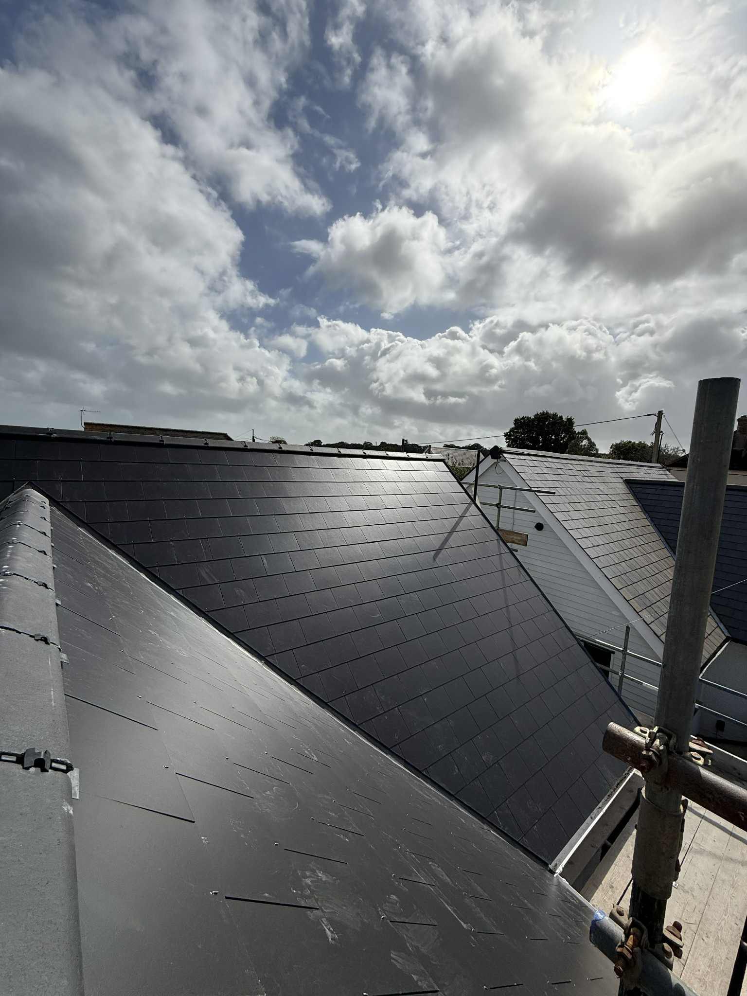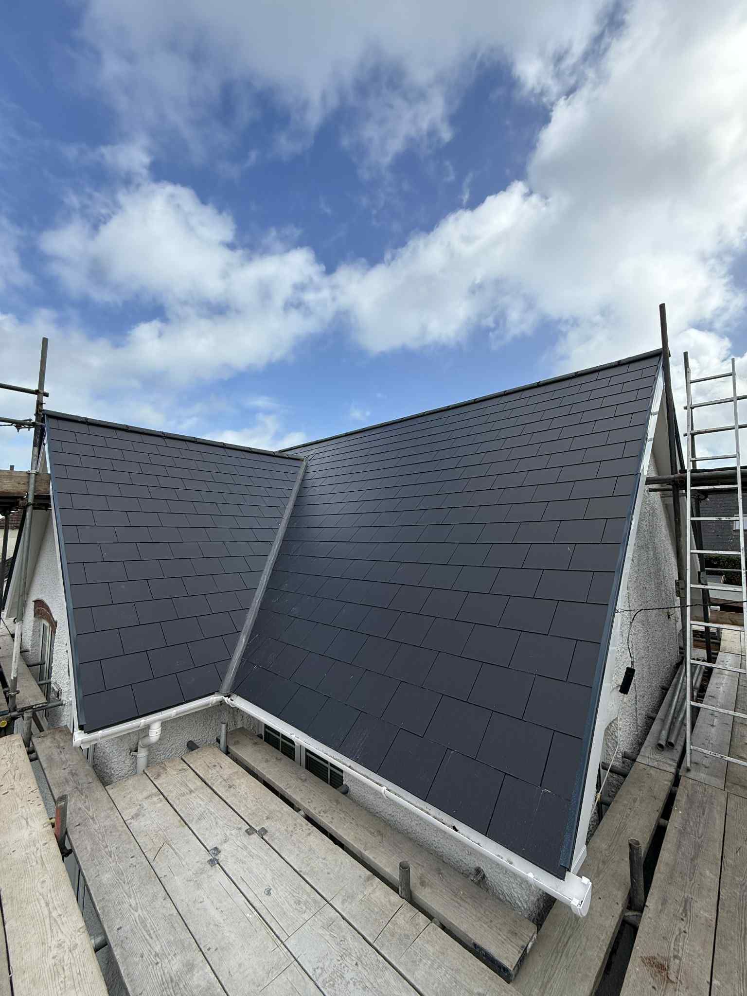 The project involved a complete strip and replace, fitting a breathable underfelt beneath new cement fibre slates with matching ridge tiles. Breathable underfelt is a modern roofing solution that allows moisture to escape while preventing water ingress, helping to keep the roof space dry and extend the life of the structure.