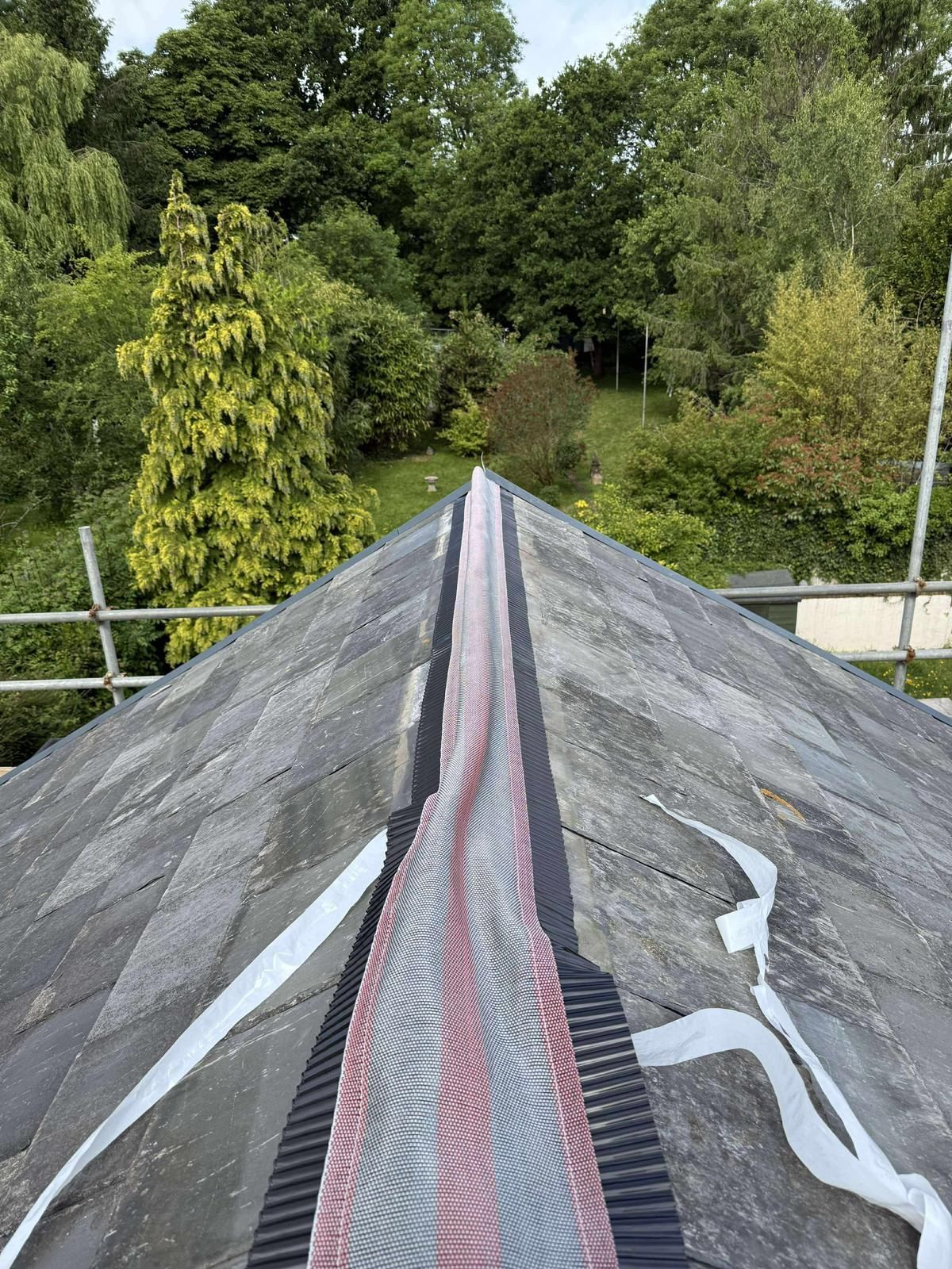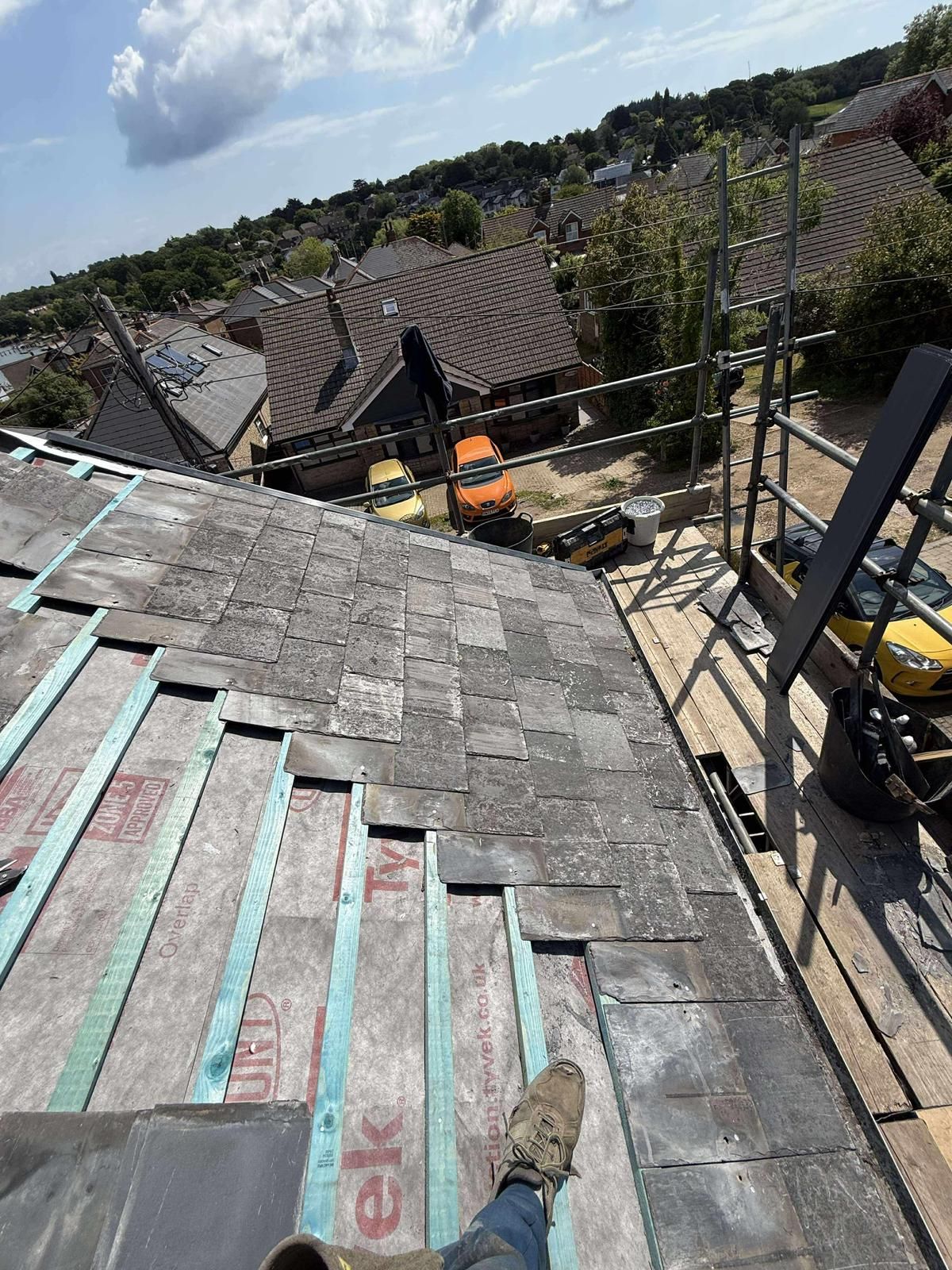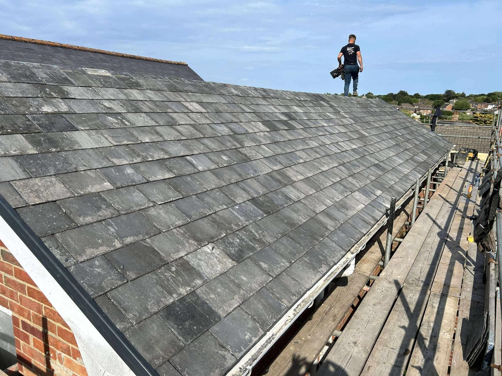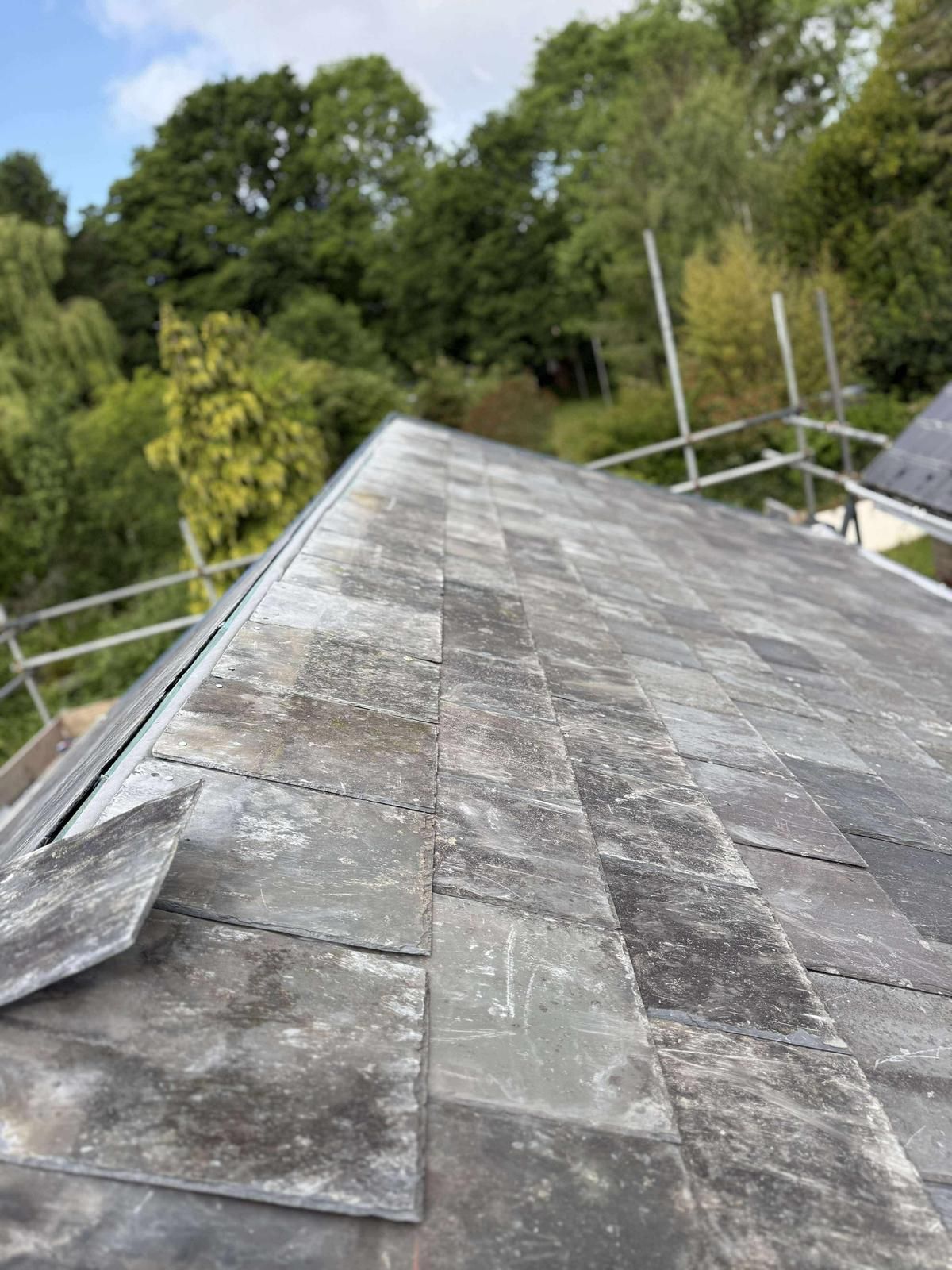 Re-roofing with reclaimed Welsh slate for charm, strength, and sustainability.